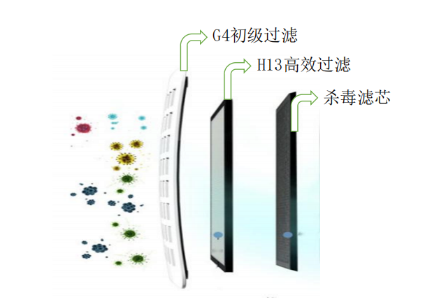 工作站内部空气安全保障——高效空气过滤系统+高效病菌消杀系统 正压系统进入的空气,必须杜绝任何病毒细菌,所以采用G4初效过滤+H13高效过滤+杀毒滤 芯三重深度保护,确保进入工作站内部空气的绝对安全无病毒。